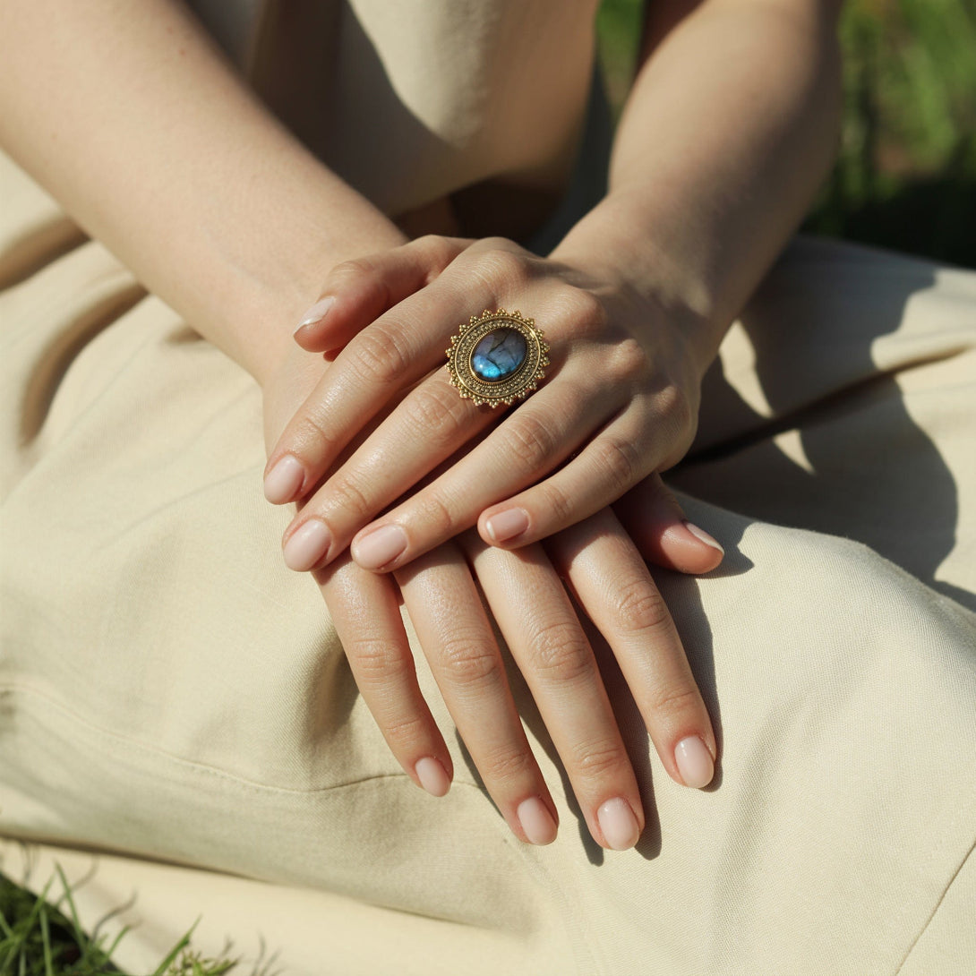 The Lunar Sunbeam Ring is a cosmic-inspired piece that brings together the radiant energy of the sun and the mystery of the moon. At the center sits a large, oval-shaped labradorite crystal, measuring approximately 2cm in length. Known as the stone of transformation, labradorite is believed to protect your energy and support inner clarity during times of change. Surrounding the stone are detailed sunray engravings that catch the light and highlight the labradorite’s natural flashes.